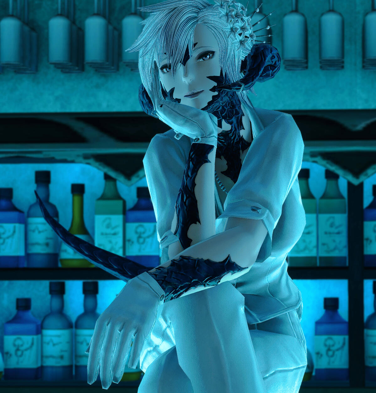 Lire is a Veena who left their cold forest home to explore the vast and often terrifying world, though it appears that after some wide and wonderful searching, she's found her comfortable niche in the world, tucked behind a bar slinging drinks and, of course, saving lives. But it's the simple pleasures that this profession offers that brightens her day, the idle chatter with customers, flirting, and listening to the stories, worries and doubts of those she serves.